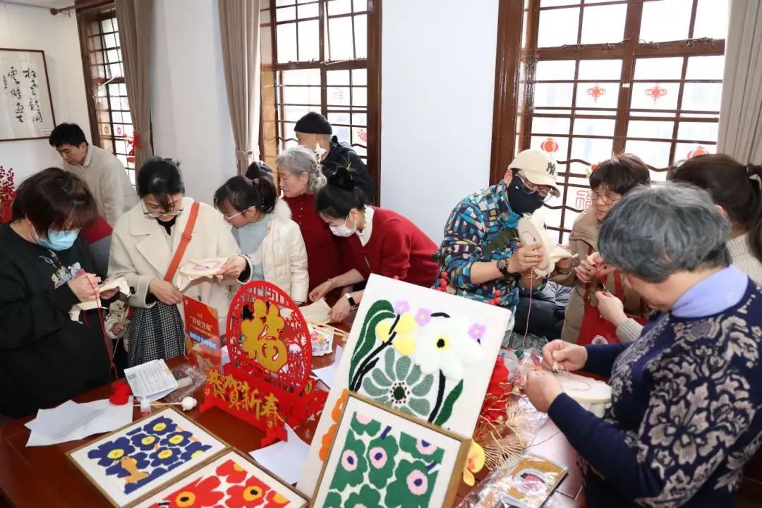 做花灯、剪窗花、画糖画、编草艺品、投福壶、捏福偶、绣福绒、猜灯谜、制作版画……在“祥蛇送福”十二生肖非遗民俗体验会环节,街道巧妙地将传统生肖文化、元宵文化与非物质文化遗产相结合,让居民们亲身体验到了投壶、草编、版画、绒绣等非遗项目的独特魅力与智慧,玩得不亦乐乎。
