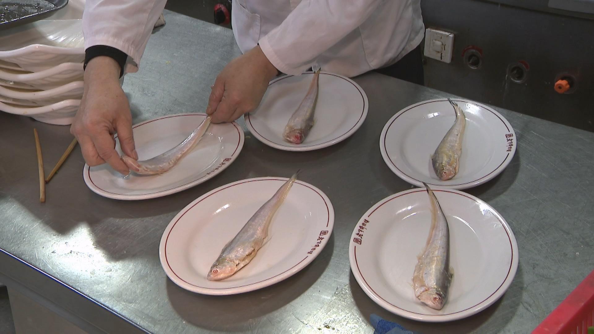 刀鱼平时生活在近海,每年3月前后,刀鱼开始由海入江,溯江而上到长江产卵,这时候的刀鱼骨刺柔软,鱼肉最为肥美鲜嫩。现在上市的大多是崇明等地的刀鱼,被称为“海刀”,鲜美无比。老半斋刀鱼汁面之所以受到食客追捧,就是因为一直以来采用传统工艺,先要把刀鱼炒制成鱼松,然后再放入老母鸡、猪大骨等10多种食材进行熬制,最终成为人们梦寐以求的刀鱼汁。老半斋大堂经理朱翠华告诉记者:“为了保持食材的新鲜,我们的刀鱼是定点供应的,价格也已经保持7年不变了。另外我们还有刀鱼馄饨的外卖馅,在美团和饿了么上面也有卖的。”