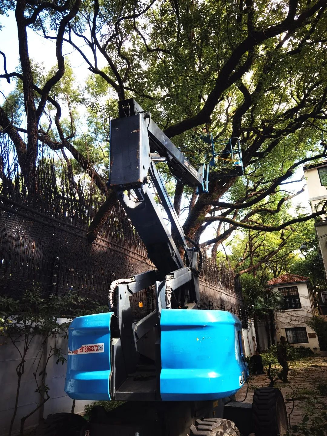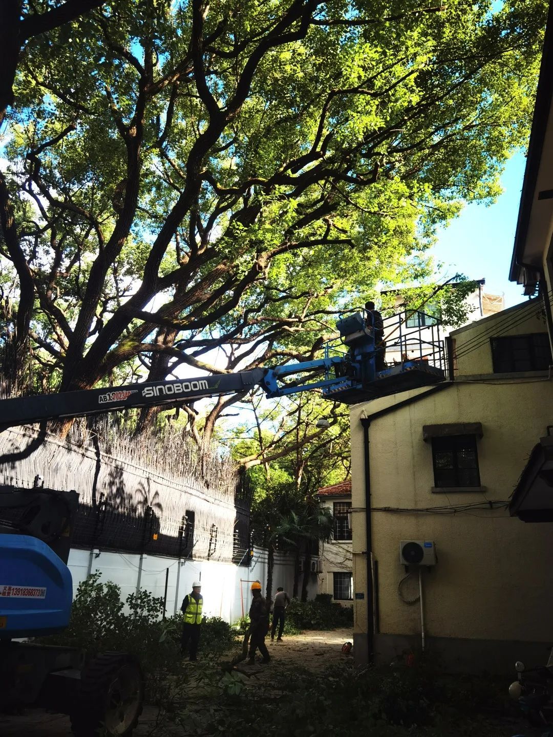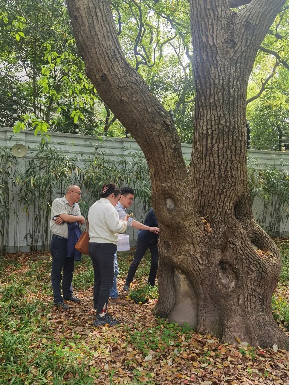 要让这片“绿色活文物”持续焕发新活力,离不开精心的科学养护。近年来,这片香樟古树群的高度和树冠都达到了相当大的体量,枯枝较多,部分枝干延伸至墙外高压线下,台风季节存在安全隐患。为保障宋庆龄故居和古树群的安全,改善植物的生长环境,促进古树群健康生长,2024年市、区古树办多次现场指导,并组织专家一树一议方案论证,根据专家意见,利用搭满堂脚手架和高架车配合精细化修剪,完成宋庆龄故居古树群专项修剪和复壮工作。