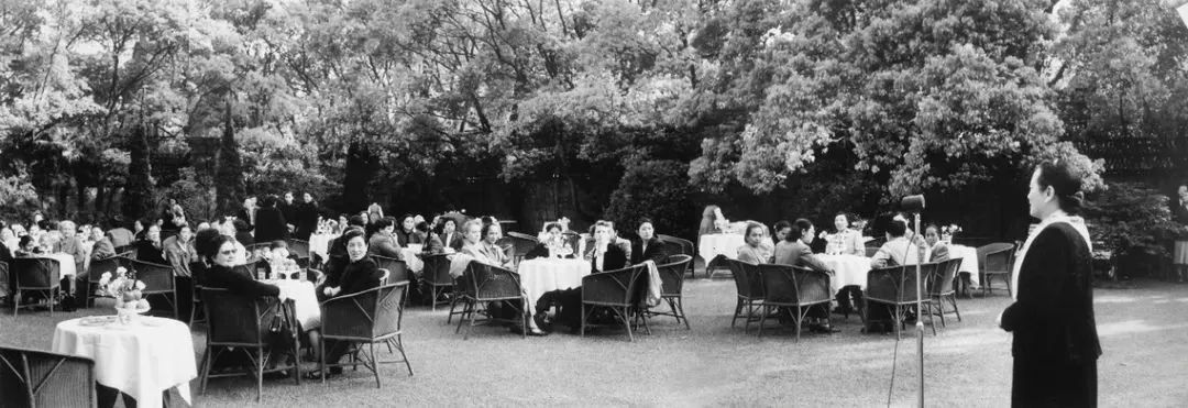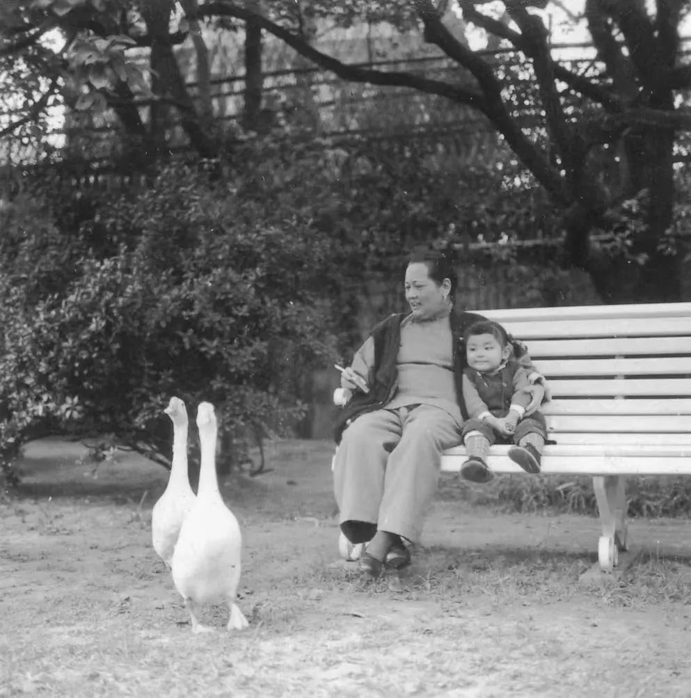 图为宋庆龄在香樟古树围绕的草坪上