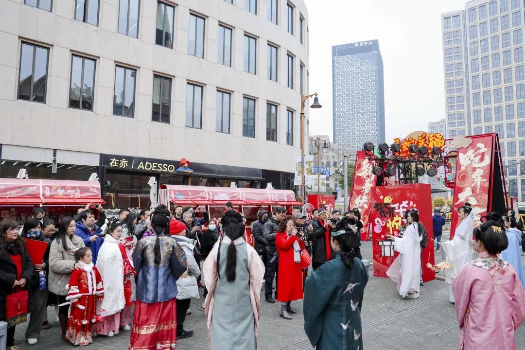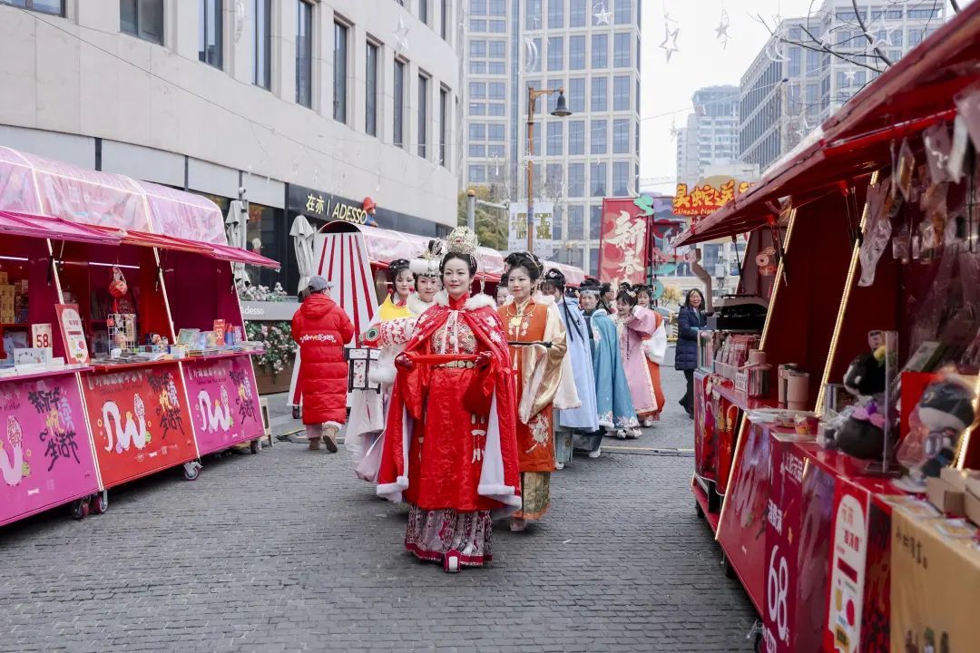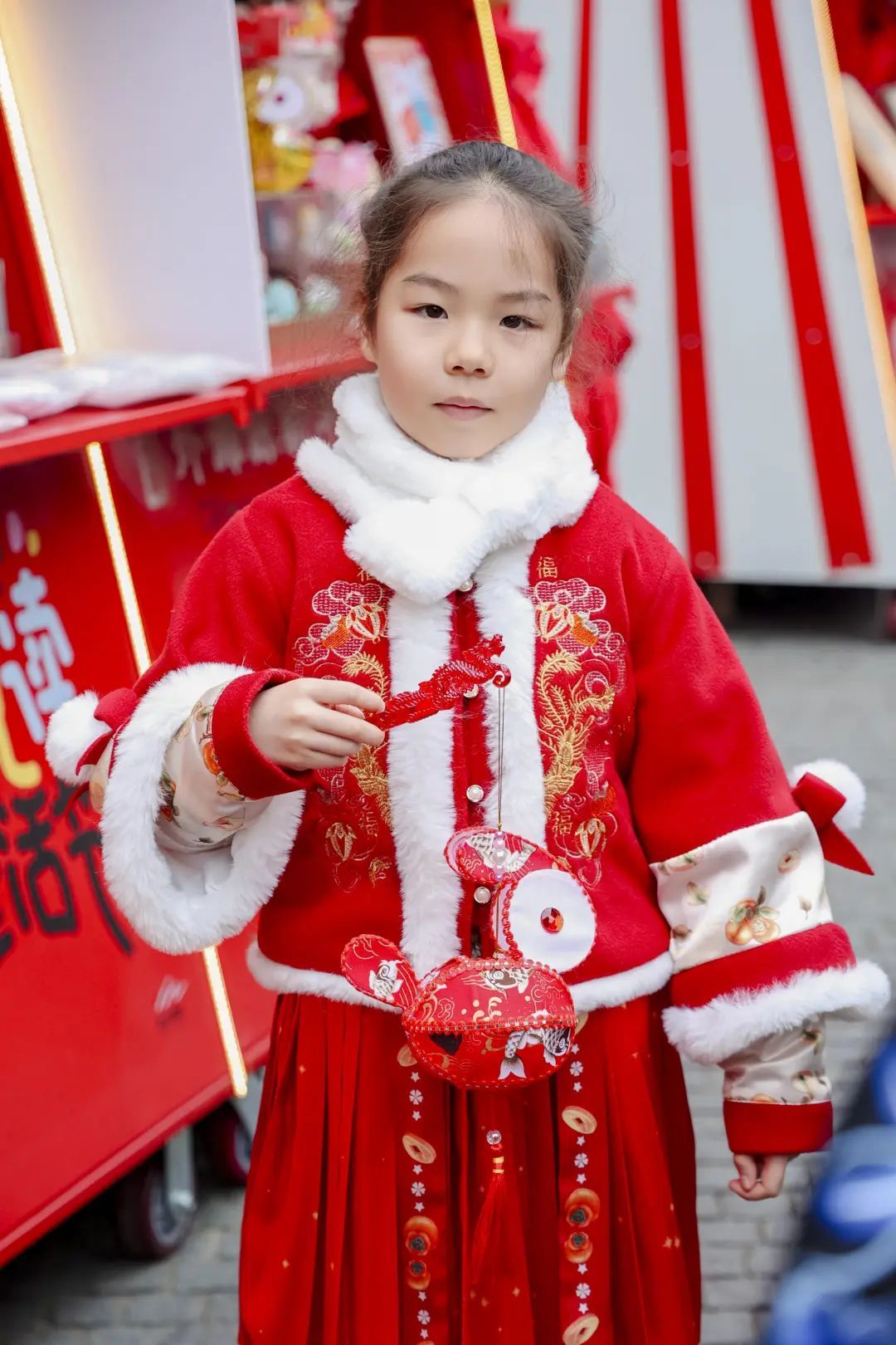 此次元宵庆典,外滩源新年集市特别策划了汉服走秀《年锦》。数十位身着华丽汉服的表演者从圆明园路步行街缓缓走过,仿佛将人们带回了千年前的盛世。各式各样的传统服饰,成为集市上一道亮丽的风景线。