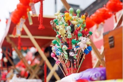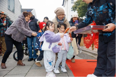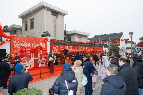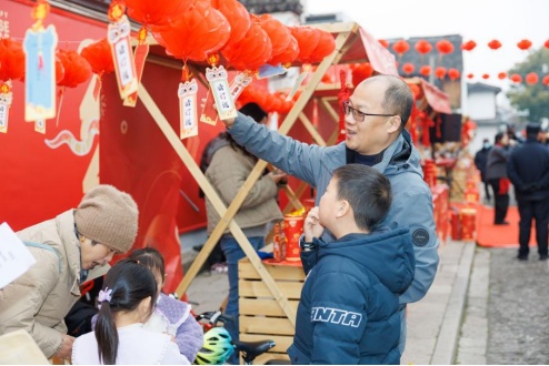 摊位与摊位之间,红彤彤的灯笼坠着灯谜,供往来观众猜谜寻趣。现场还能品尝到多种口味的汤圆、香甜软糯的焋糕和果香四溢的糖葫芦。“我们是从上海市区过来的,今天元宵节,特别来古镇买些汤圆带回去。”山女士手中提着几大盒汤圆,在与同伴饶有兴味地赏玩市集后,对记者表示,“这里的活动挺有意思的,好吃、好玩又好听,年味十足,热闹喜庆!”