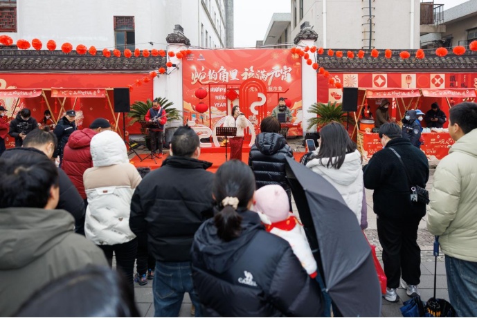 本次活动以“蛇韵角里 福满元宵”为主题,内容丰富、亮点纷呈,展现了不少非遗技艺——捏面人栩栩如生,糖画晶莹剔透,造型各异的花灯流光溢彩,寓意吉祥的书法作品力透纸背、更添喜气。游客、居民或是驻足聆听歌手的深情演唱,或是在舞台周围的市集摊位上流连忘返。