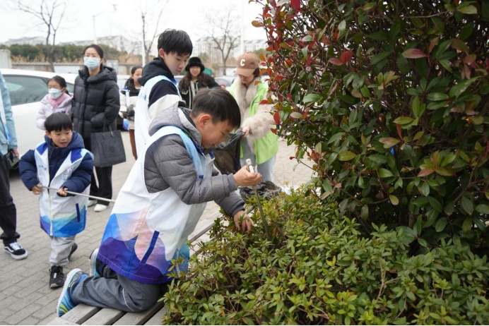 吃完美味的汤圆,快递小哥志愿者与小学生家庭志愿者共同走上街头,开展“大手牵小手——文明旅游随手捡”活动,努力为周边社区居民打造整洁干净的节日环境。