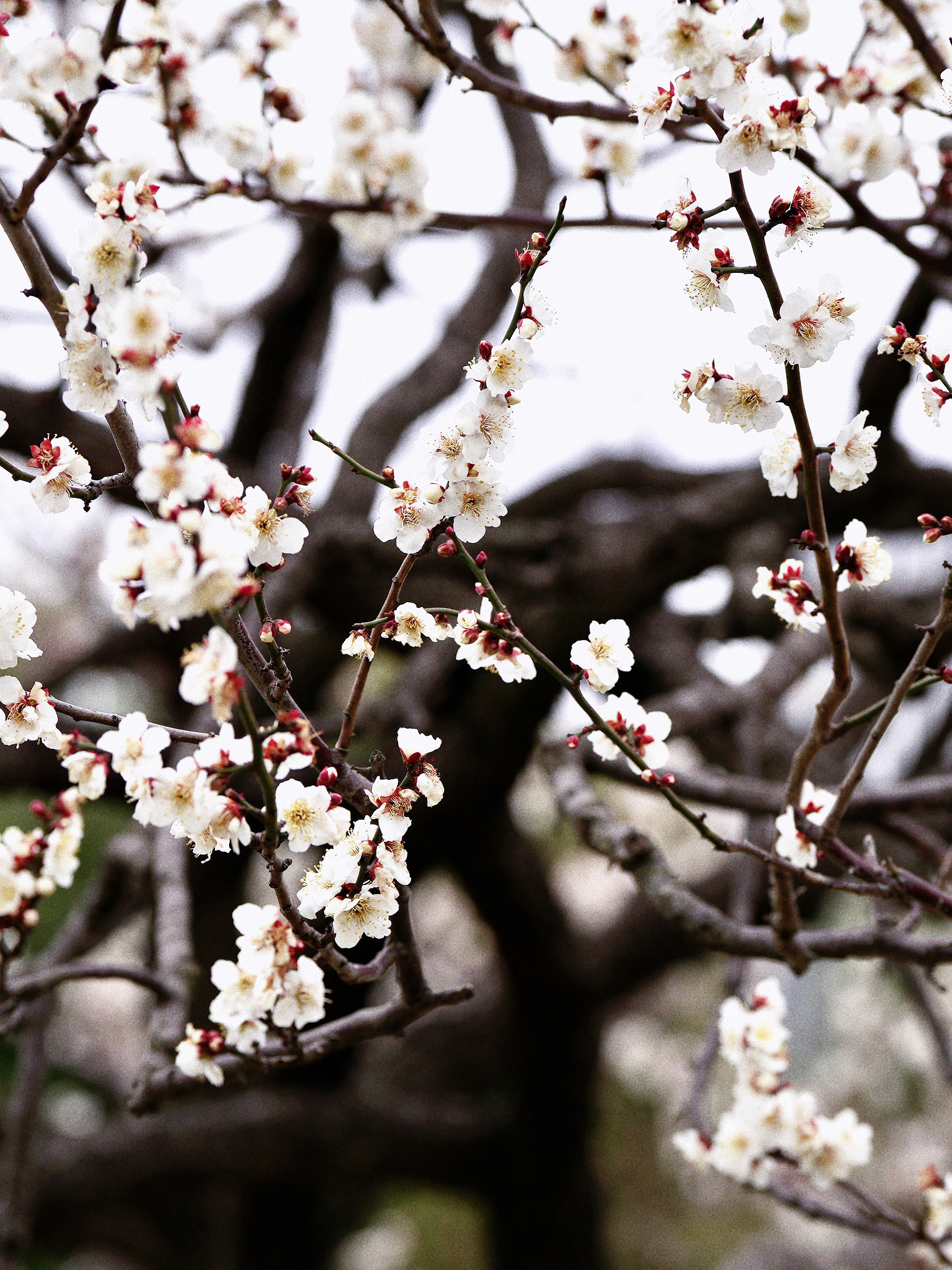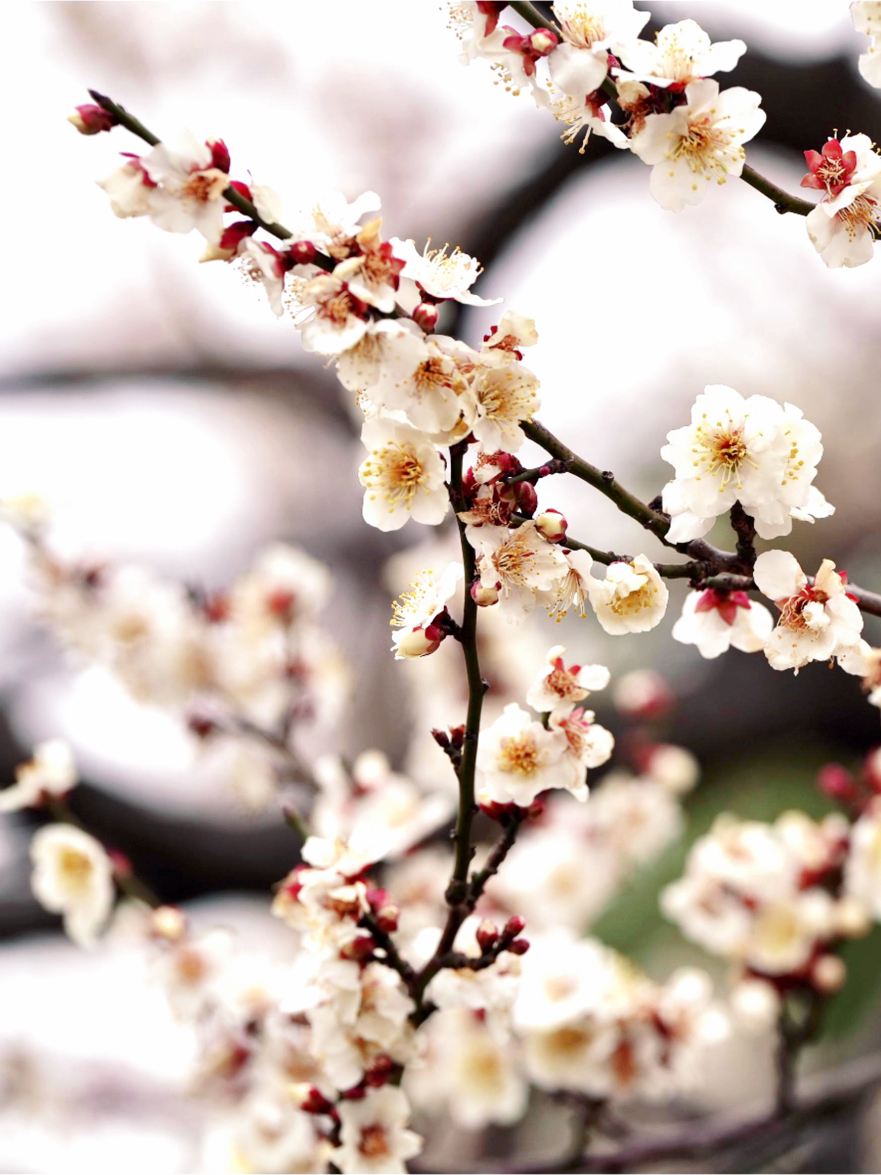 梅枝虬曲盘错,枝头上缀满了花苞。一些花蕾已经次第开放,娇艳欲滴的红梅和优雅纯净的白梅,夹杂着悠悠清香的空气,与灿黄娇艳的蜡梅,勾勒出无尽的生机与希望。
