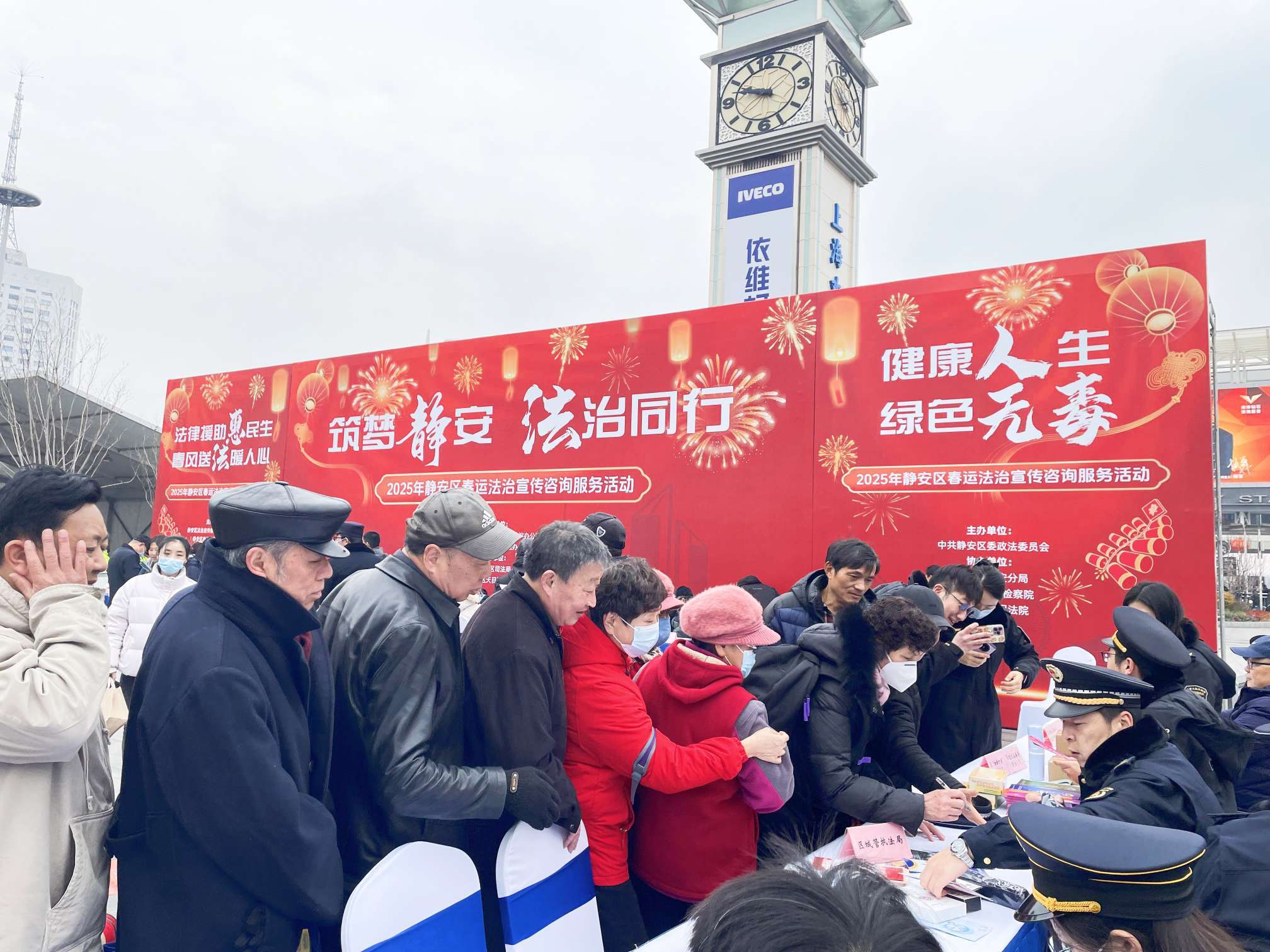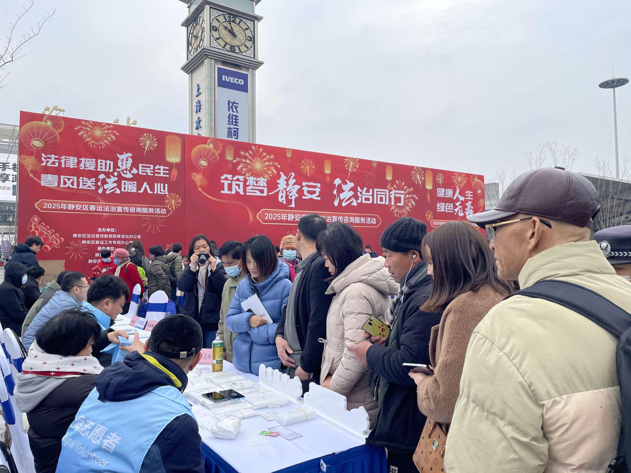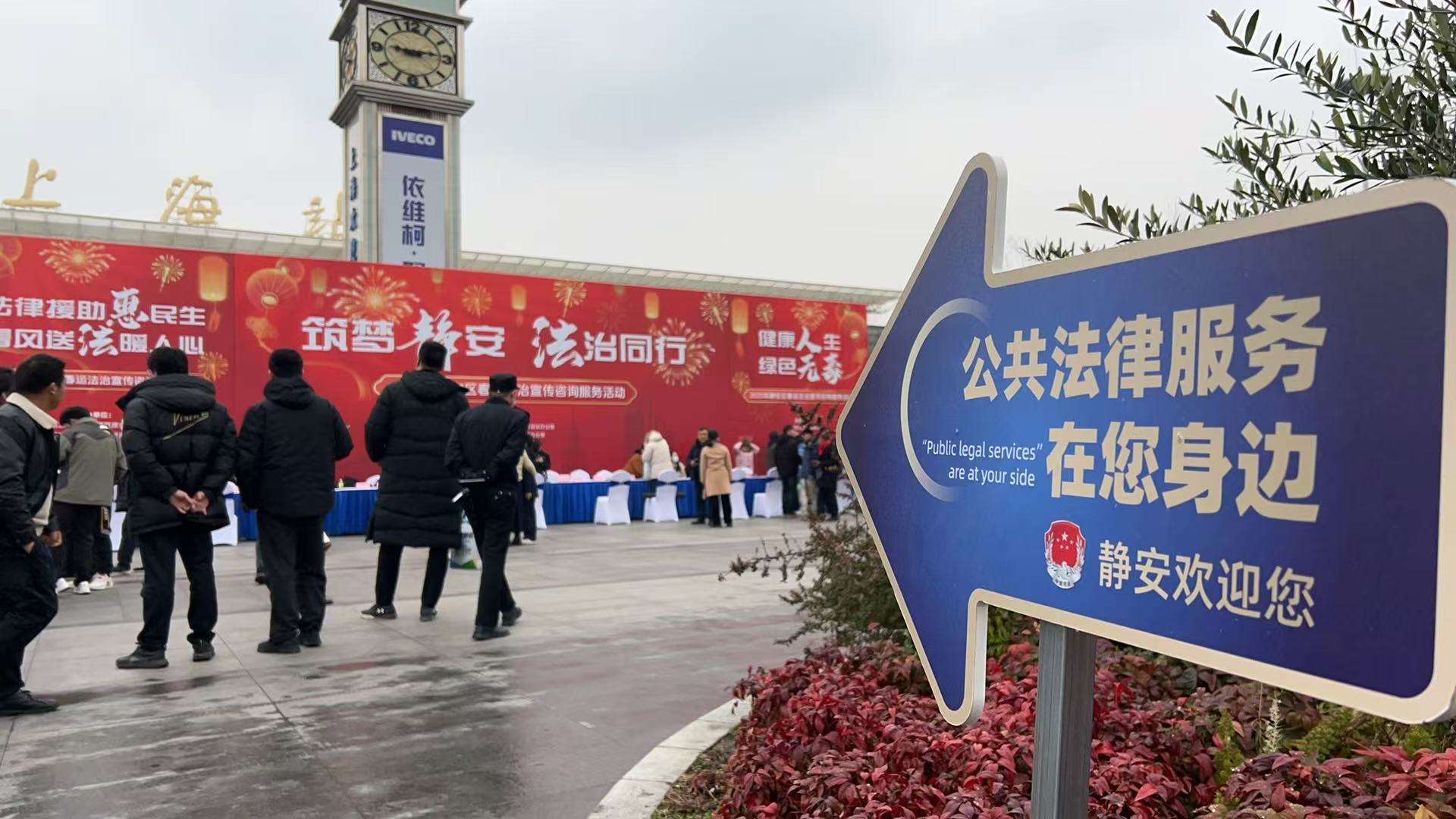 2月12日,静安区在上海站南广场世博钟楼下举行2025年春运法治宣传咨询服务大型现场活动。