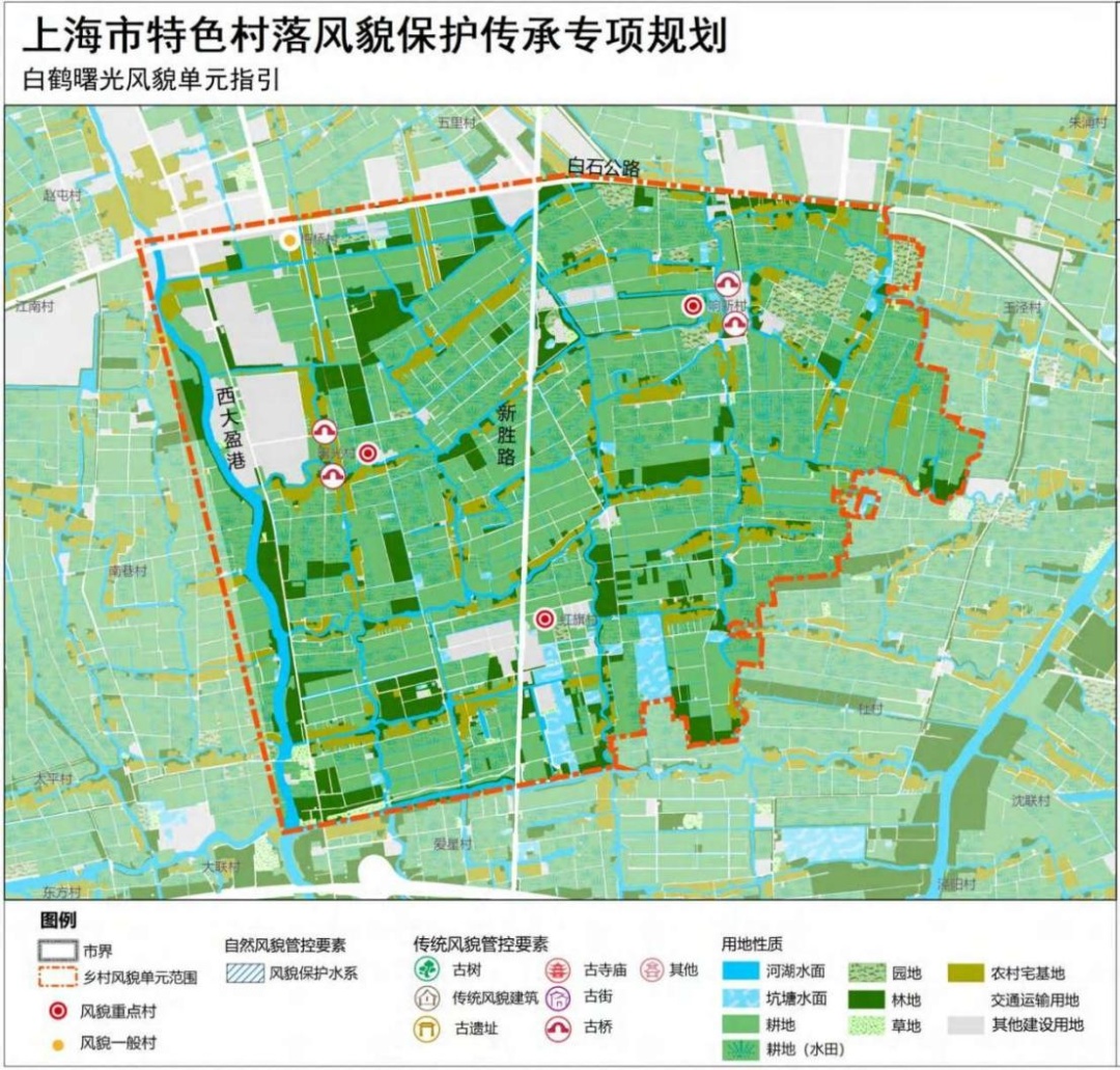 白鹤曙光单元 位于青浦新城北部,靠近古青龙遗址,总面积约12平方公里,是由水、林、田、湿、村构成的纤网型风貌的典型代表。该单元由曙光村、红旗村、响新村、南巷村、梅桥村5个行政村构成,其中曙光村、红旗村和响新村为风貌重点村。单元内村落呈现塘泾绕田、水曲泾弯的典型风貌格局特征,以“一”字形沿河线性生长为主要特色。