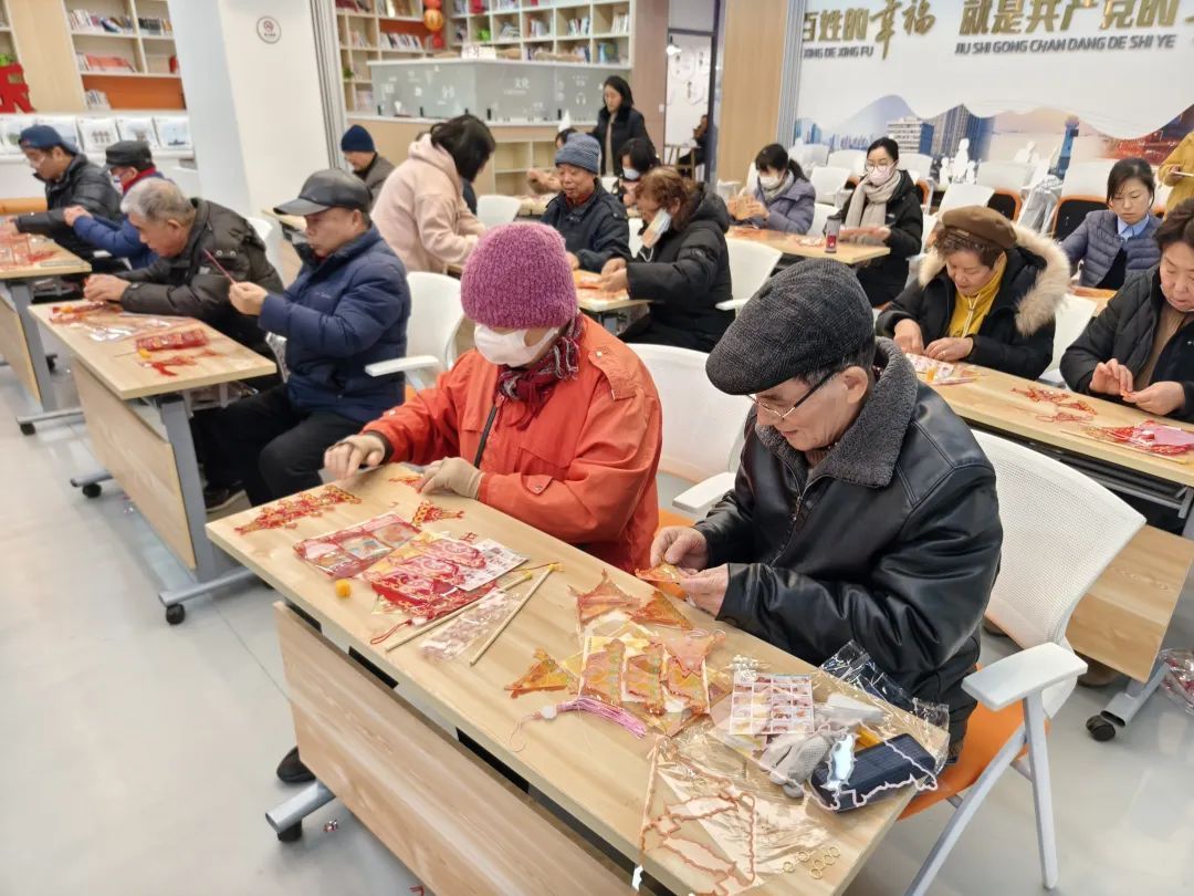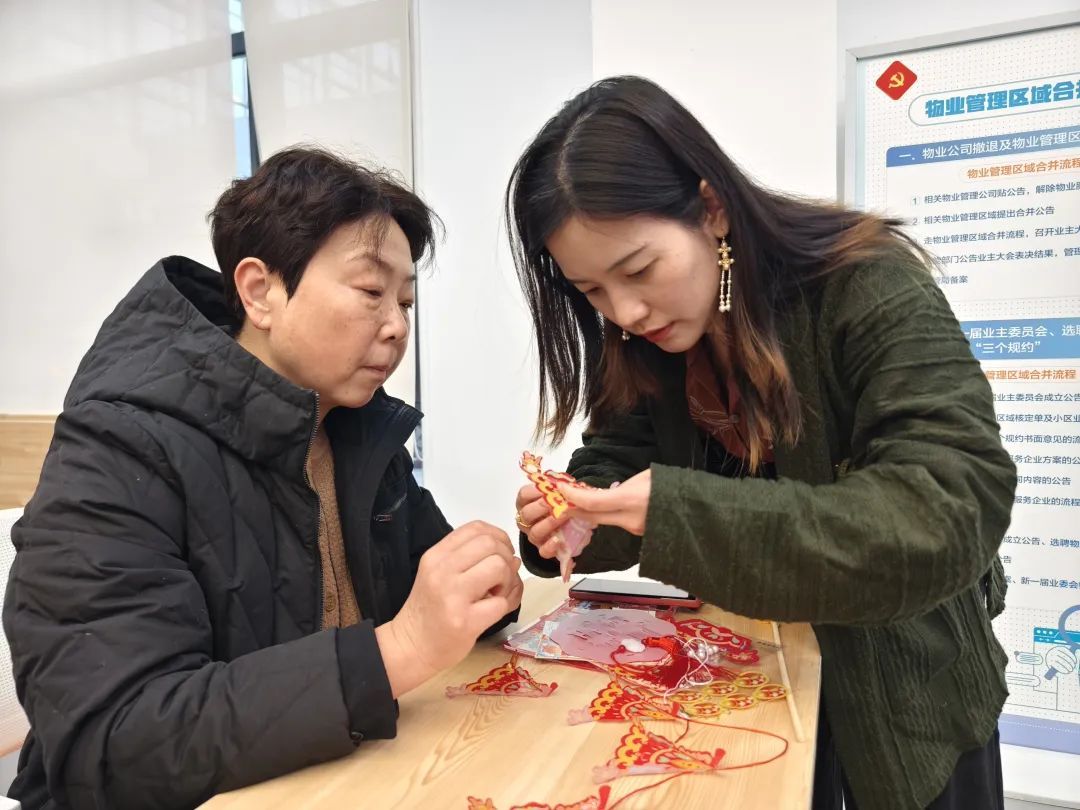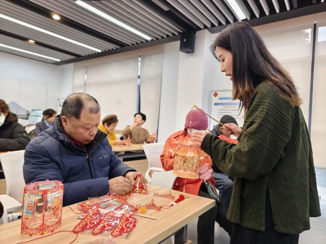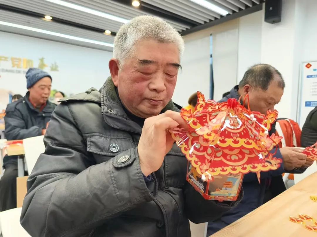 虽然说起来不难,但是对于这些零基础的居民来说,动手将一袋子纸片一样薄的“零部件”组装成玲珑剔透的宫廷灯笼,还是非常有挑战性的。好在辅导老师就在身旁,随时可以答疑解惑为他们“赋能”,宫廷灯笼的制作对于有心人而言并不难。
