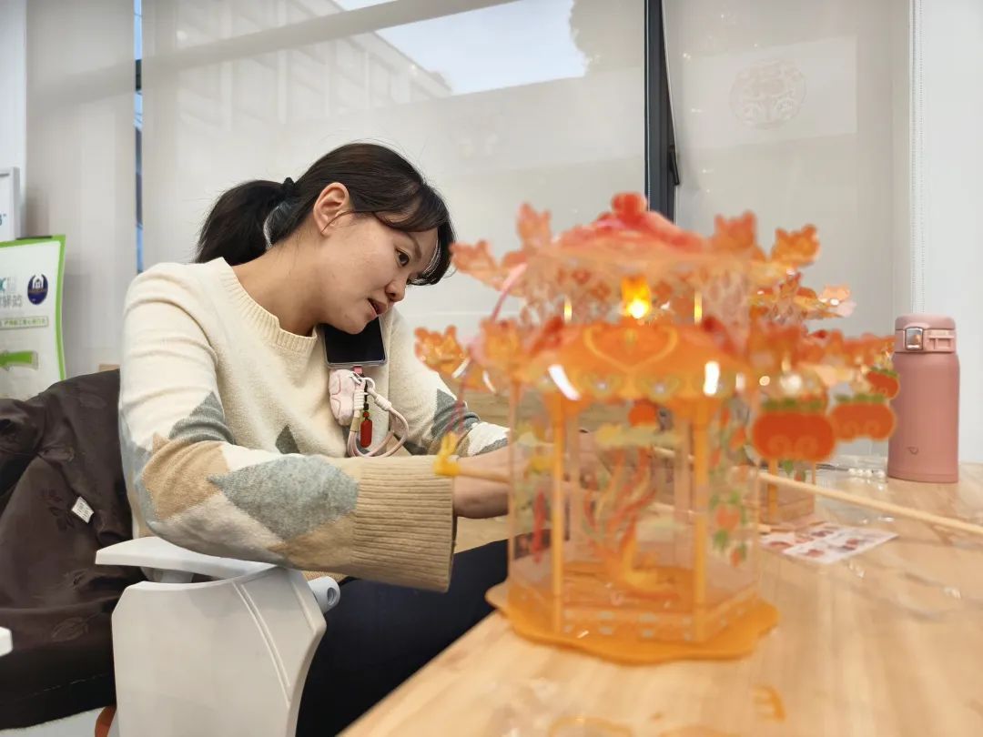 辅导老师表示:“宫廷灯笼是传统的六角亭结构,寓意着我们中国的传统文化中亭台楼阁的造型。元宵节又称灯节,我们老百姓会点灯过节。这个灯笼还有一个很特殊的设计,就是每个灯的下面会有一些镂空的吉祥话语,在灯点亮之时,投影非常好看,比如这款红色的底座投影是年年有余。”