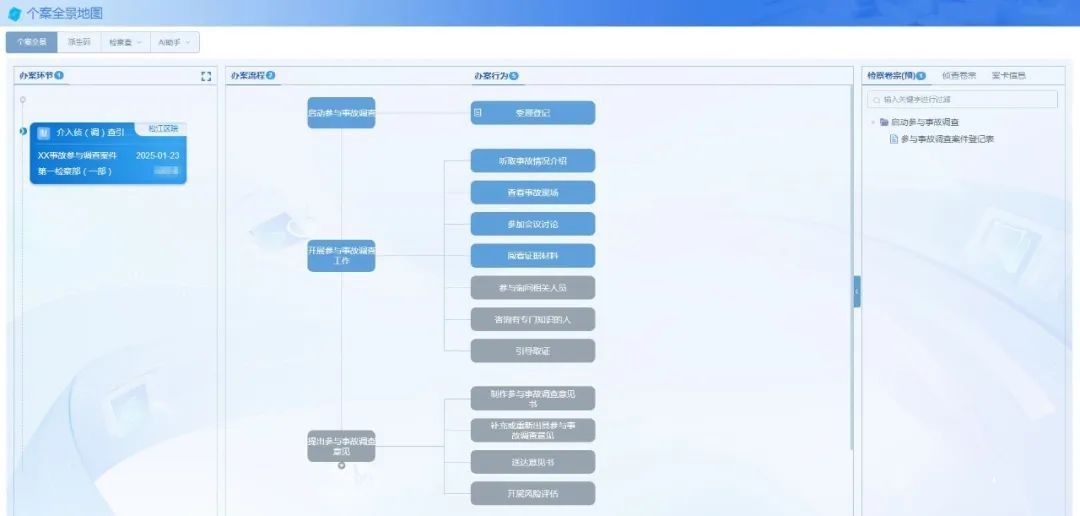 从启动、开展参与事故调查,到开展立案监督、移送犯罪线索、源头治理等检察履职,在个案全景地图的辅助下,安全事故调查检察官在工作中,可以实现案件全流程在线办理与办案行为全过程记录留痕。