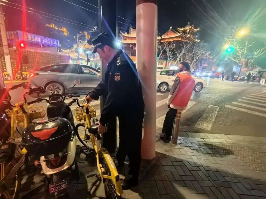 针对共享单车乱停放的问题,执法队员现场进行了集中整治。执法队员将乱停放的共享单车规整摆放,确保道路畅通,为市民和游客创造良好的出行环境。