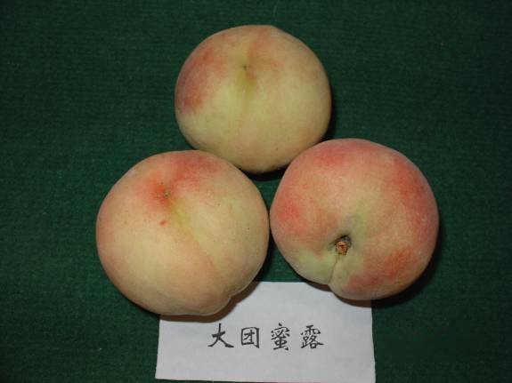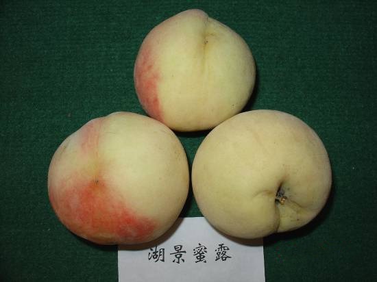 果实近圆形,整齐,缝合线浅。果个极大,平均单果重225g,最大果重275g左右。成熟时果面底色绿黄色,果肉白色,近核处红色。肉质软溶,汁液中等,味浓甜,可溶性固形物含量为13%以上,上海地区7月中旬成熟。