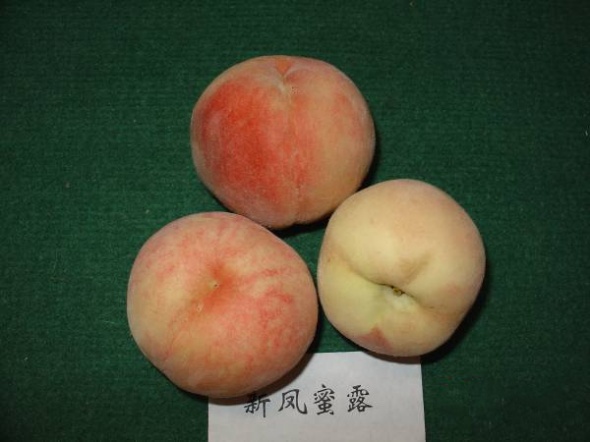 “新凤蜜露”果形整齐、近圆,单果重180g,最大果重400g,果皮乳黄色,向阳面鲜红色,肉乳白色,汁多,可溶性固形物含量为13%以上,味浓甜,有香气,粘核,品质上等,上海地区7月上中旬成熟。