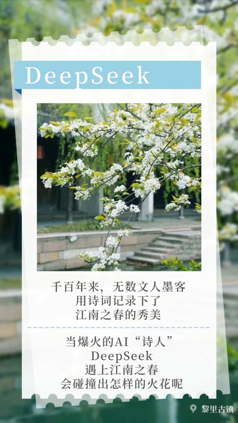 DeepSeek版新诗融合春雨、春花、春日美食等元素,生动描绘了青浦春景的生动与鲜活,表达了对青浦之春的无限陶醉与留恋。