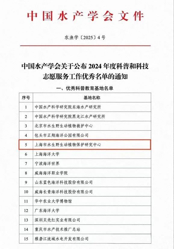 值得一提的是,中国水产学会近日公布了2024年度科普和科技志愿服务工作优秀名单,上海市水生野生动植物保护研究中心科普基地中华鲟梦园获评中国水产学会2024年优秀科普教育基地,这是该中心连续第二年入选该名单。