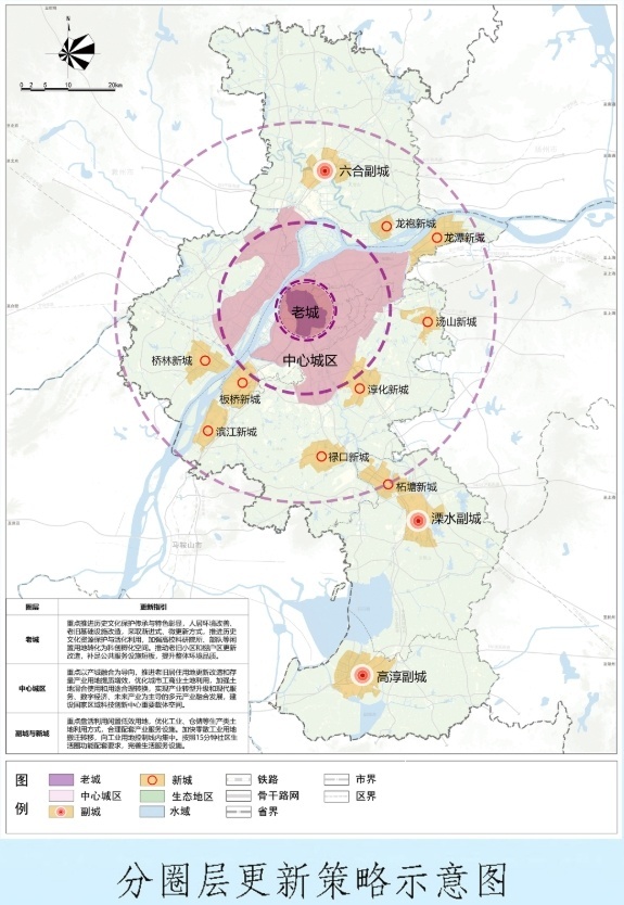 分圈层,老城重点推进历史文化保护传承与特色彰显,人居环境改善、老旧基础设施改造;中心城区重点推进老旧居住用地更新改造和存量产业用地提质增效;副城、新城重点盘活利用闲置低效用地,优化工业、仓储等生产类土地运用,合理配套产业服务设施。