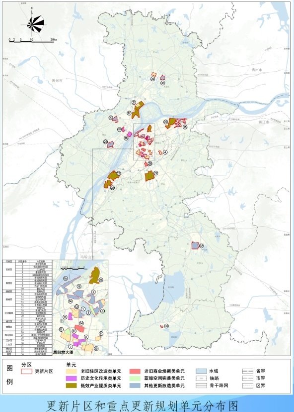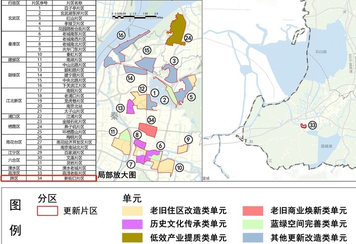 根据专项规划,全市划定更新片区34个,作为市级层面统筹更新工作的重点区域。其中,主城六区较为集中,占了一半。例如,城北下关的滨江片区、燕子矶片区、中央北路片区、花园路板仓街片区、红山片区;城中的中山北路、百子亭、玄武湖等片区;城南包括老城南北、西、东三个片区等。