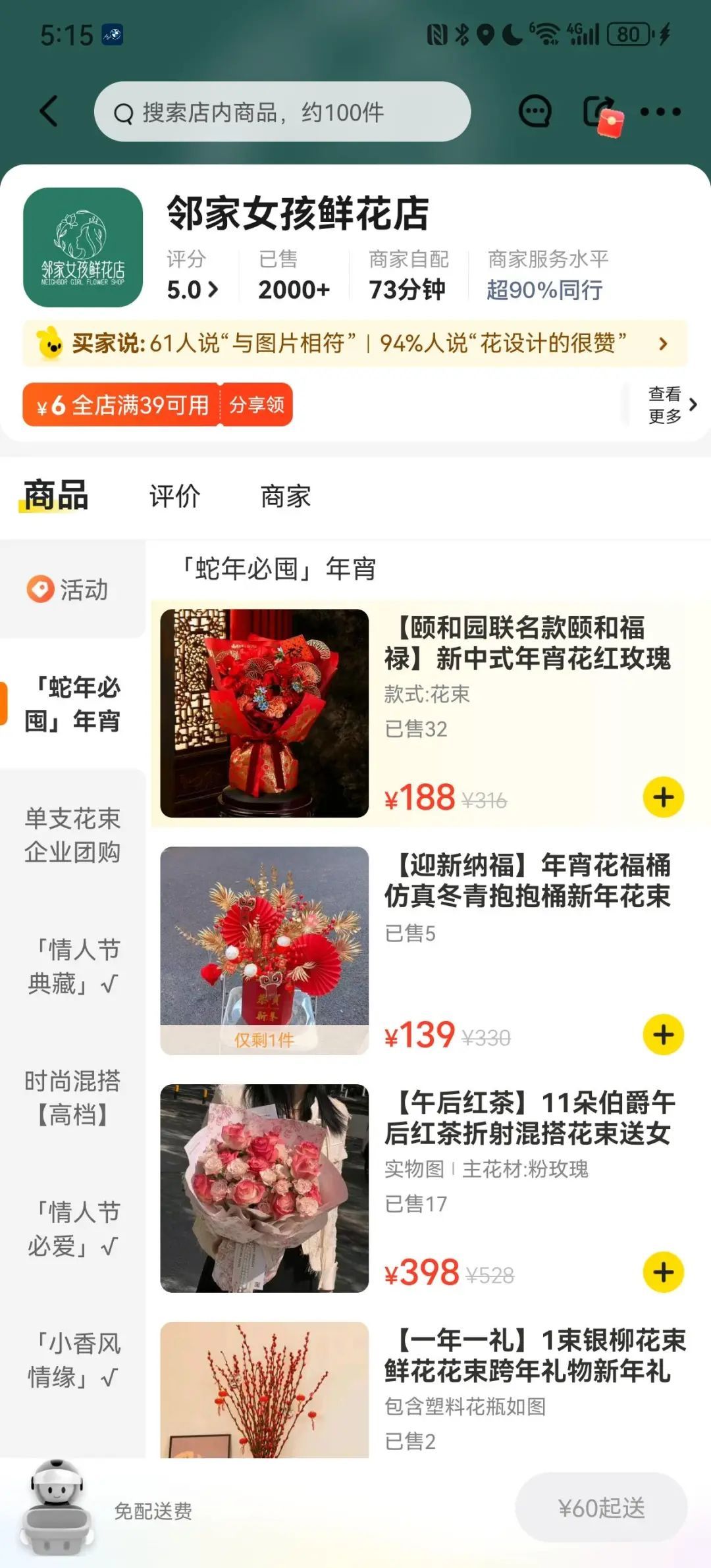 “今年春节是从业以来年宵花卖得最好的一个节日,国风鲜花产品热销,超出了此前预期。”位于牛庄路上的一家花店负责人表示,春节以来,新中式主题花束在外卖渠道十分畅销,需求持续呈现递增状态。最重要的原因在于,年轻消费者尤其喜欢“国风”,习惯线上外卖下单,借鲜花送非遗文化给亲友。