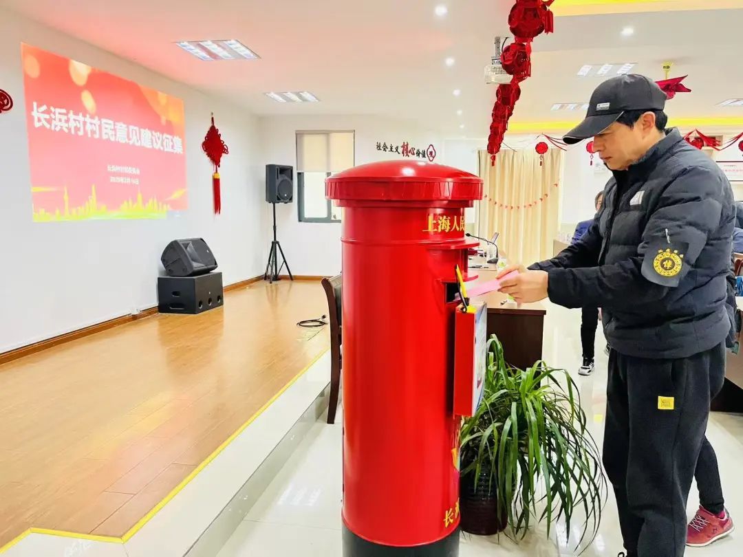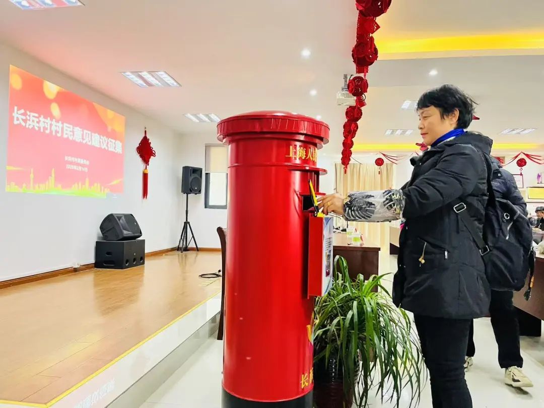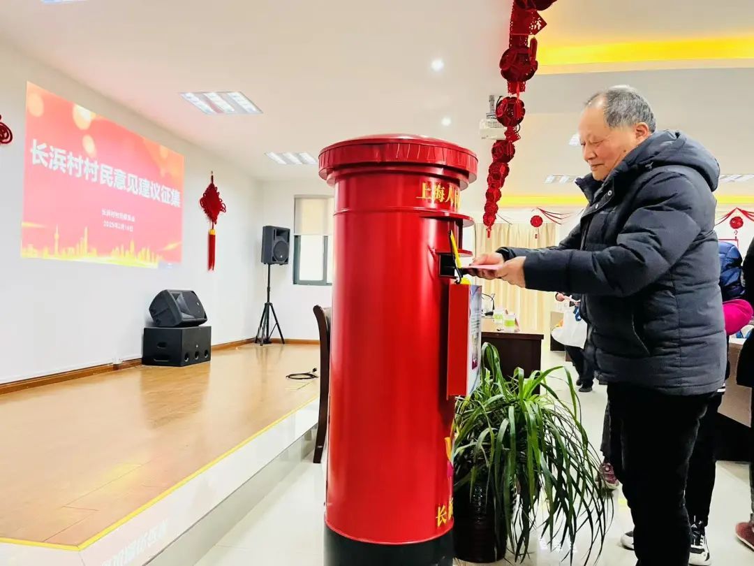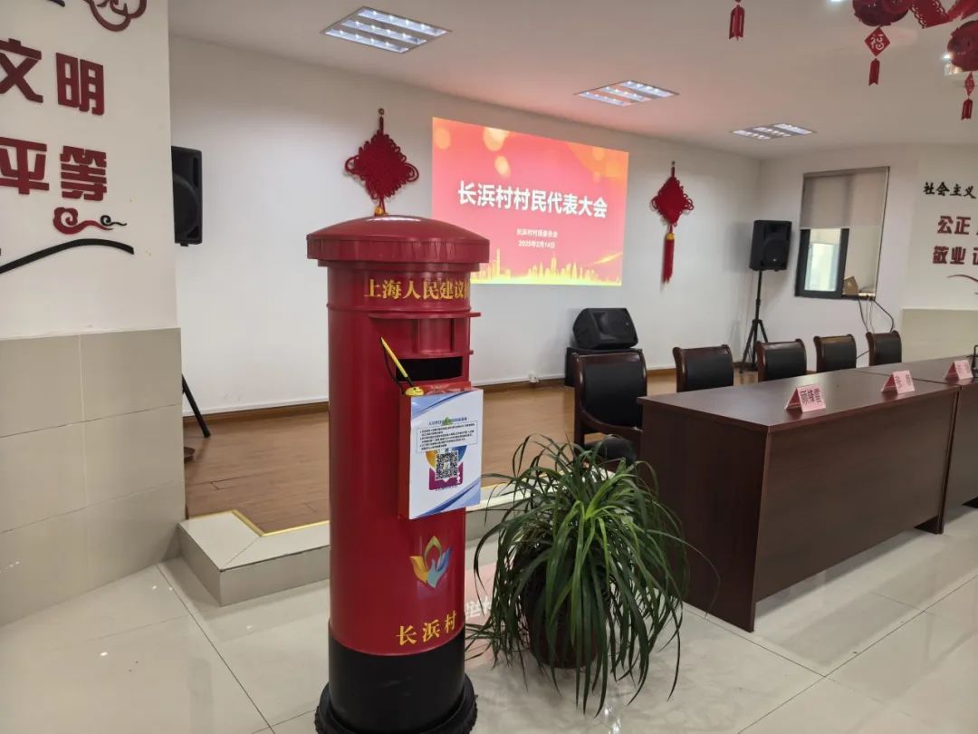 2月14日,庄行镇长浜村召开村民代表大会,会场内靠近西侧摆放着一个红色的邮筒,引起了村民们的关注,大家纷纷议论,这个邮筒究竟是派什么用处的呢?