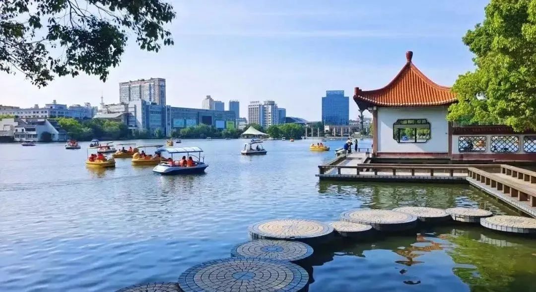 镜湖公园由大小镜湖两部分组成,大镜湖俗称“陶塘”,小镜湖为“汪家田”。因其水清可鉴,形似圆镜,“水惟不竞形俱鉴”,故名“镜湖”。这里是芜湖的散步胜地。