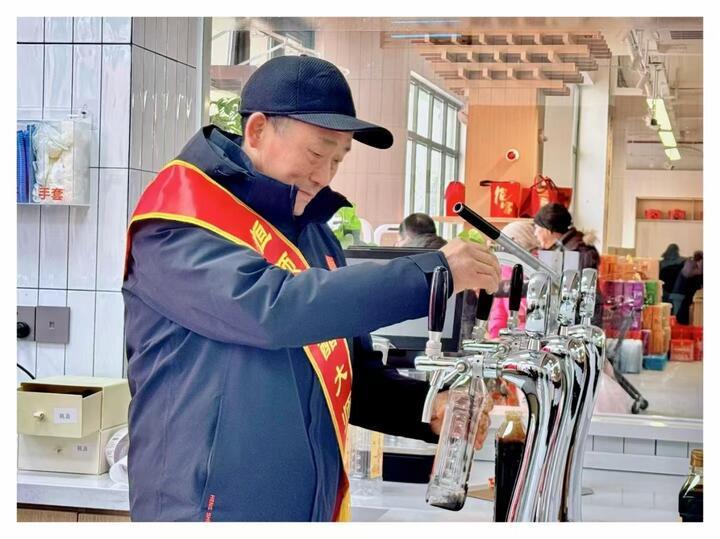 “3、2、1,开坛咯!”春节期间,随着三口酱缸上的喜庆红绸布被揭开,镇江市民手提各式容器,排着长队等待着打酱油。香醋酿造技艺国家级代表性传承人乔贵清等为市民游客展示了老酱油的新打法:一手拿空壶,一手按压扳手,将浓郁香醇的酱油精准灌入壶内,待壶满时,只需松开扳手就能快速停止酱油灌入壶内,再压上瓶盖,一瓶手工打出的酱油就完成了。