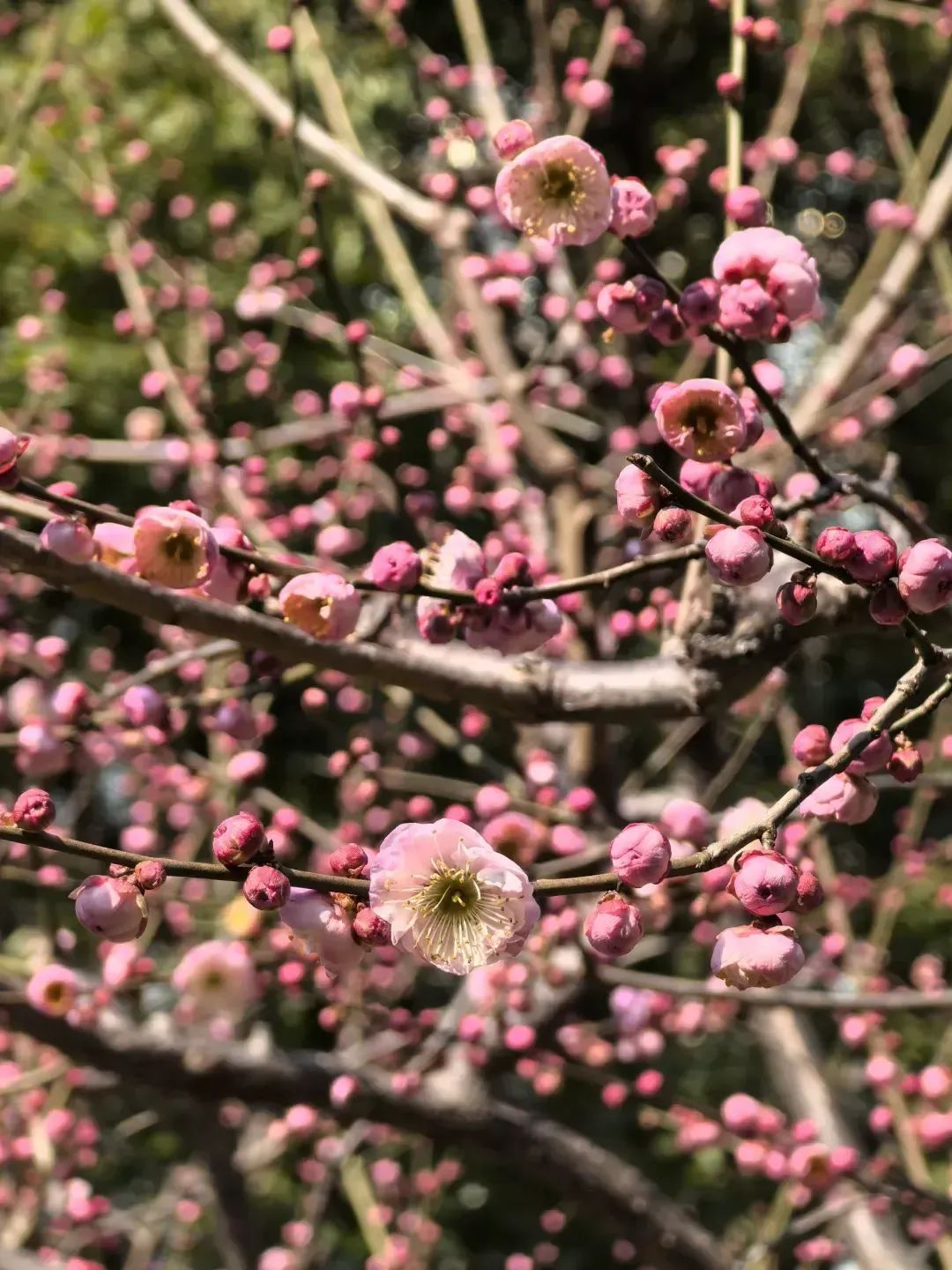 公园内靠近佳茹亭周边的几株梅花静静地伫立在园林中,枝干遒劲,姿态万千。粉白相间的花苞已缀满枝头,有的含苞待放,有的已然盛开,在微风中轻轻摇曳,恍惚间仿佛仙子,在风中翩翩起舞。