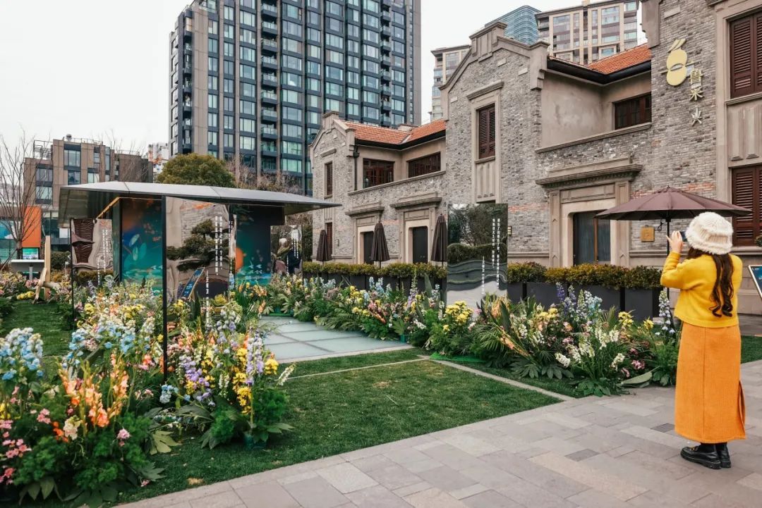 慎余里广场“变身”醒春苗圃,空气中浮动着飞燕草、鸢尾与洋牡丹的甜香,市民们穿行其间打卡拍照,仿佛踏入莫奈笔下的春日花园。镜面打造的艺术装置折射出斑斓花影,与镜面上的经典电影台词同框,定格一幅幅优美的春日画卷。