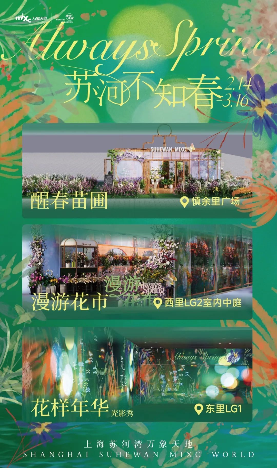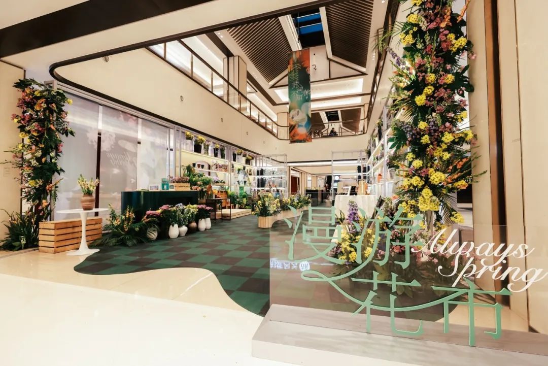 西里LG2室内中庭则呈现一场漫游花市,将花鸟虫鱼市场搬到商场。商场巧妙地在其中引入花植设计品牌BLOOMMANOR、洛杉矶新奢时尚品牌At Cherine、中国传统美学与法式复古风珍珠饰品品牌SALTY PUMPKIN、艺术融合品牌界么多、复古艺术画廊品牌MOND等6大品牌快闪,于2月15日至3月2日联袂呈现一场走花路市集。