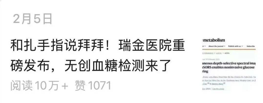 2025年春节后开工首日,双方的研究成果惊艳亮相。瑞金医院官方微信发布 “和扎手指说拜拜!瑞金医院重磅发布,无创血糖检测来了”的消息,瞬间引发广泛关注。陈昌兴奋地说:“相关话题短时间内就冲上同城搜索榜首、百度和微博热搜前十,这是对我们团队多年努力的最好认可。”