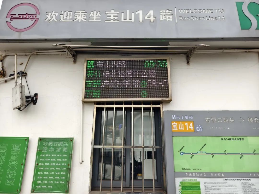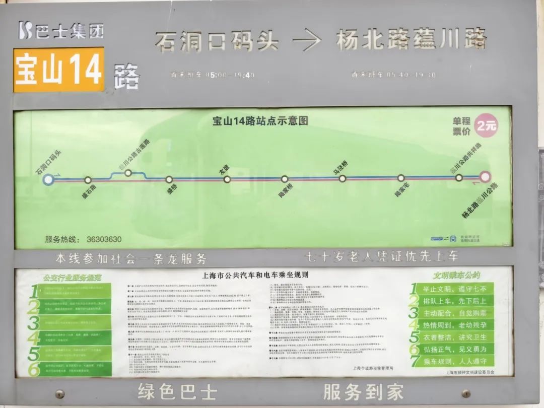 宝山14路公交线路全长10.76公里,首末班车时间为:杨北路蕰川路为5:40至19:30);石洞口码头为5:00到19:40,日常配车5辆。宝山14路不仅连接了地铁一号线富锦路站和石洞口码头,还途经月浦、盛桥等人口密集区域,为市民往返宝山与崇明岛提供了便利。