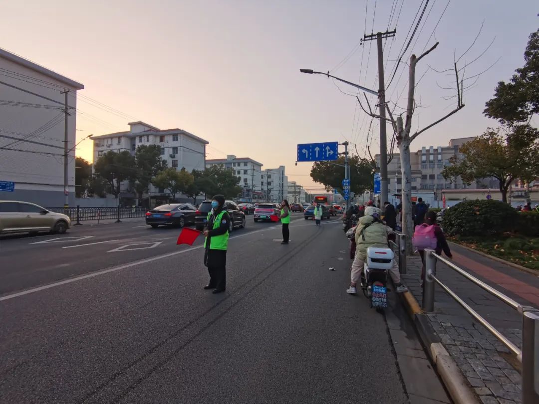 上午7时许,在松江区民乐学校门口,民警、老师、家长志愿者早早到岗,身着反光背心,在进入学校的通道上站立,迎接孩子们的到来。民乐学校紧靠松江城区南北向主干道人民北路,学校两侧又是小区出入口,人流量、车流量都较为密集。松江公安分局交警支队的民警们在人民北路人行道及道路两侧值守,指挥人流、车流有序通过。据介绍,为应对上学车流与早高峰车流叠加所产生的大流量,民警们通过提前上岗、延迟撤岗的方式,护航校园周边的道路交通安全。
