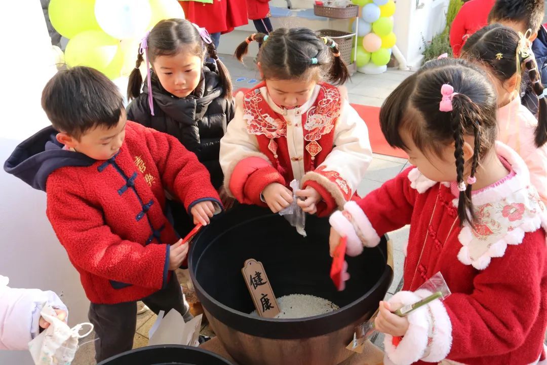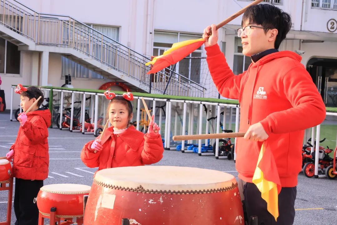 一句句“新年快乐”是老师温暖的祝福,一声声“好久不见”是最真挚的欣喜,徐汇区望德幼儿园的入园仪式充满了浓浓的民俗氛围。孩子们将红包里的谷米倒入贴有福字的大米缸,祈求新年“百米纳福”。同时,孩子们敲响好运锣鼓,开启新一年的“成长惊喜”。漕河泾社区的锣鼓队与舞蹈队的老师们身着汉服翩翩起舞,用曼妙舞姿展示“最美中国色”,让孩子们领略到了传统之美。