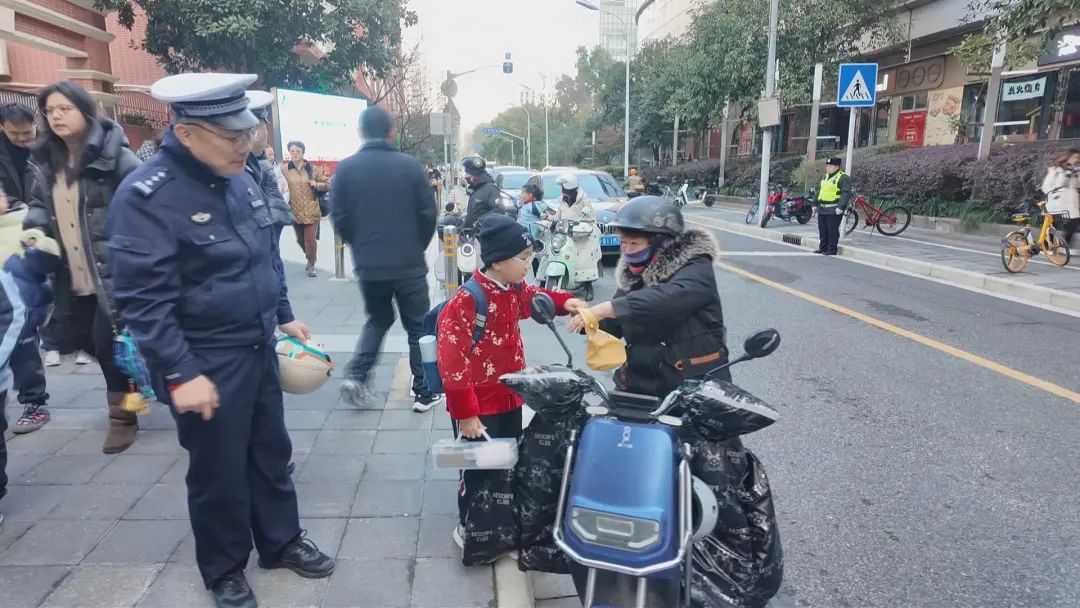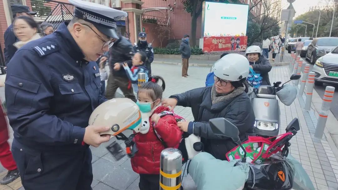 今天一早,在黄浦区曹光彪小学门口,交警们忙碌地向学生和家长们介绍“共享头盔”的借用方法。只见交警们耐心细致地讲解着,偶尔发现有乘坐电动自行车却没有戴头盔的学生,便及时上前询问原因。有的学生表示“忘记了”,有的学生则说“天太冷了,戴了帽子不方便”。交警们不仅向学生和家长强调了佩戴头盔的重要性,还详细介绍了“共享头盔”的使用方法。