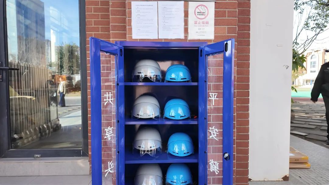 华东师范大学第四附属中学的“校园共享头盔”服务点位于学校正门保安室的对面,一个高约1.5米的蓝色储物柜内,分层存放着10顶头盔。其中,灰白色、稍大一点的头盔供家长借取使用,而蓝色稍小的则对应孩子使用。头盔服务点配备了专门的工作人员,负责登记、发放和回收头盔。“每个服务点的头盔数量是根据学校的学生人数和实际需求来设定的,确保能够满足早高峰时段的借用需求。”服务点的一位工作人员向记者介绍道,“家长和学生只需要在登记表上填写姓名、时间和联系方式等基本信息,就可以免费借用头盔,如此便解决了很多家长因忘带头盔而导致无法上路的困境。”此外,工作人员还补充道,学校会定期检查头盔的使用情况,做好清洁消毒和维护保养工作,确保每一顶头盔都符合交通安全和卫生标准。