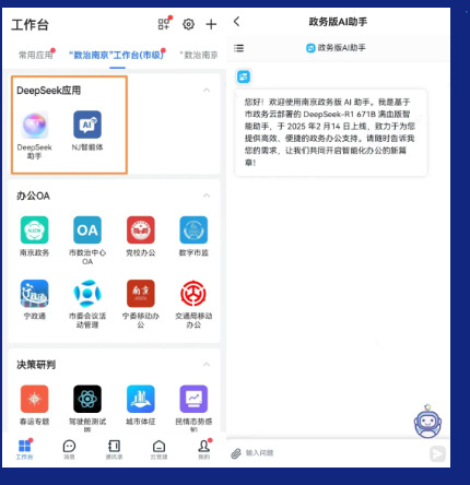 同时,多个基于DeepSeek开发的数据局智能助手、南京政务版AI助手、智能问数、公文起草等一系列智能化应用也同步上线测试,为政府决策、公共服务和社会治理注入智能动力,推动政府部门工作效率与服务质量提升。