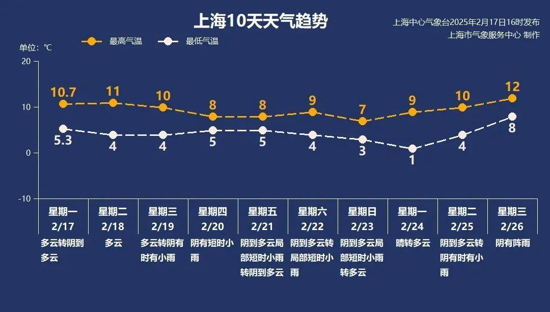 【多阴雨】明天起到周日期间,上海较多阴雨天气,雨水总体较弱,主要出现在周四前后。气温全面回落至个位数,在3℃-10℃之间,体感比较湿冷。下周一前后有短暂的晴好天气,但下周中起,阴雨天气又再度增多。