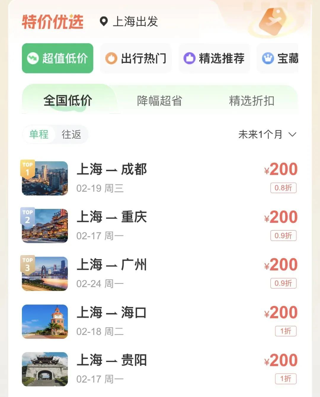 2月中下旬,北京→三亚、北京→长沙、北京→杭州、北京→昆明、上海→成都、上海→重庆、上海→广州、上海→海口等热门航线均有低于1折的机票在售,票价低至200元。从上海出发,前往哈尔滨、长春、德宏、成都、沈阳等地,机票降幅超75%。其中,上海→哈尔滨的机票降幅达到了81%,最低只要200元!
