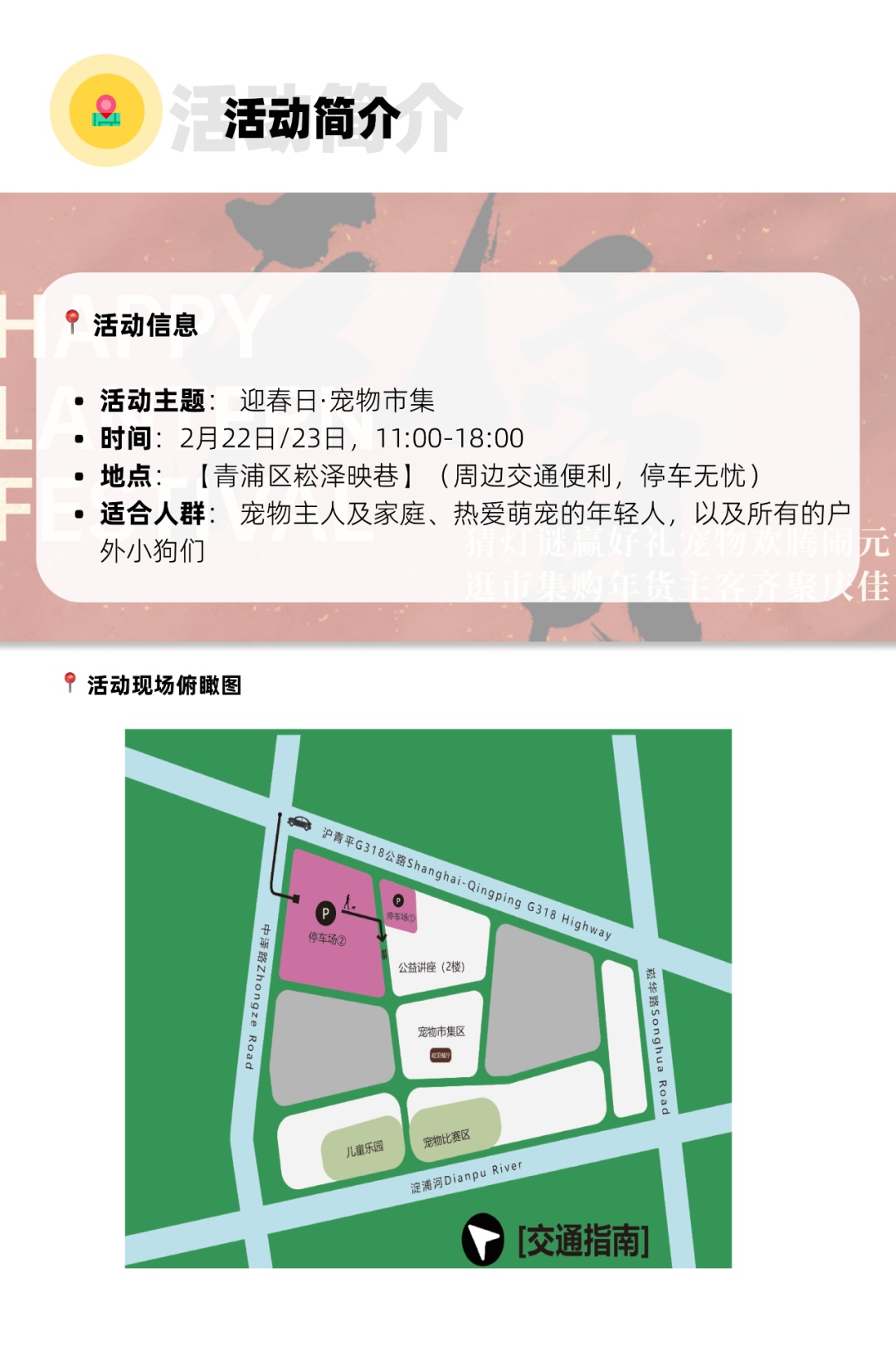 本次宠物艺术节的主题是“迎春日、乡村宠物艺术节”,欢迎大家带着宠物与朋友们一同来体验春天的活力与欢乐。活动现场将设有多个精彩环节,趣味十足的游戏挑战、宠物集市、公益摊位等内容,让你和你的毛孩子度过一个充满惊喜的周末。