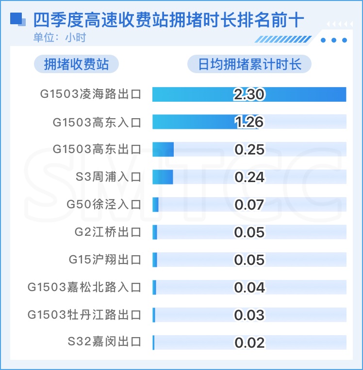 高速公路拥堵较上季度略有缓解,拥堵收费站出入口个数由上季度11个减至10个,日均累计拥堵时长较上季度减少1小时。拥堵时长排名前三为G1503凌海路出口、G1503高东入口和G1503高东出口,其中除G1503高东出口拥堵时长较上季度略有增长外,其余两个拥堵时长较上季度均略有减少。