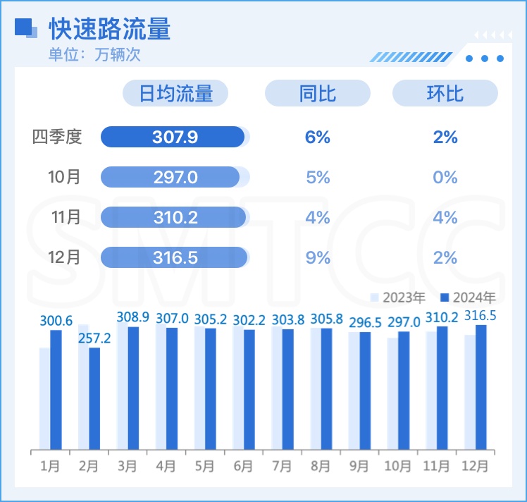 四季度本市快速路流量逐月上升,日均流量307.9万辆次,较上季度上升2%,同比上升6%。
