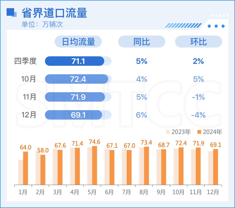 四季度省界出入沪流量逐月下降,日均流量71.1万辆次,较上季度上升2%,同比上升5%。其中出沪 35.8万辆次,入沪35.3万辆次。