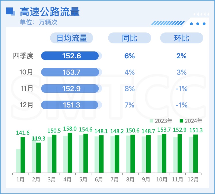 四季度本市高速公路流量逐月下降,日均流量152.6万辆次,较上季度上升2%,同比上升6%。
