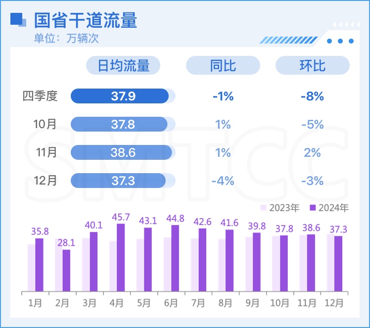四季度本市普通国省干道流量日均流量37.9万辆次,较上季度下降了8%,同比下降1%。其中普通国道日均流量10.1万辆次,较上季度下降3%,同比上升2%;普通省道流量27.8万辆次,较上季度下降10%,同比下降2%。