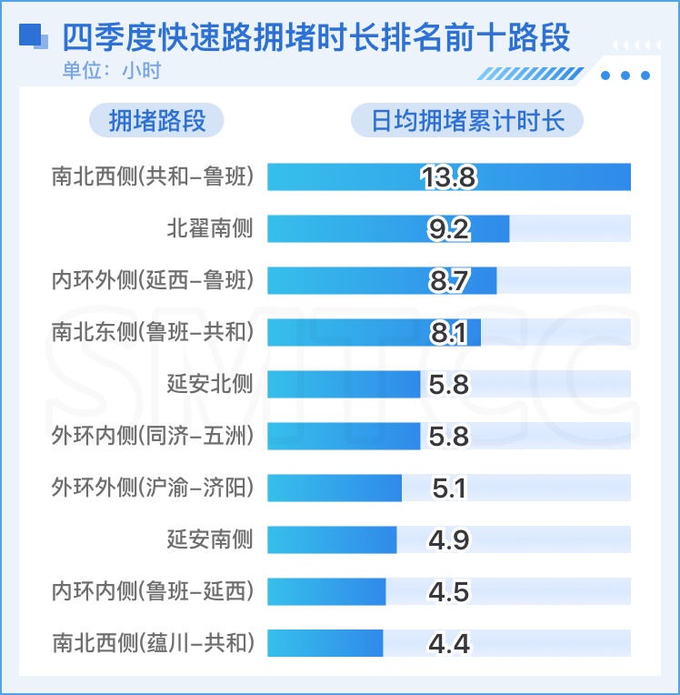 快速路较上季度交通拥堵加剧,拥堵区段由上季度31个上涨至36个,日均累计拥堵时长较上季度增加15.9小时。拥堵时长排名前三为南北西侧(共和-鲁班)、北翟南侧和内环外侧(延西-鲁班),其中北翟南侧由上季度的第四名上升至第二名,拥堵时长较上季度增加了1.1小时。