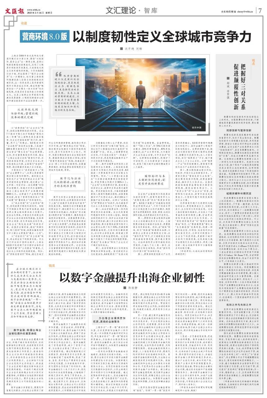 优质营商环境不仅是便利化指标的组合,更是制度适应力、创新包容力、生态协同力的系统呈现。未来上海的营商环境建设,应当致力于培育滋养创新的制度土壤,打造更具韧性和进化能力的生态系统。