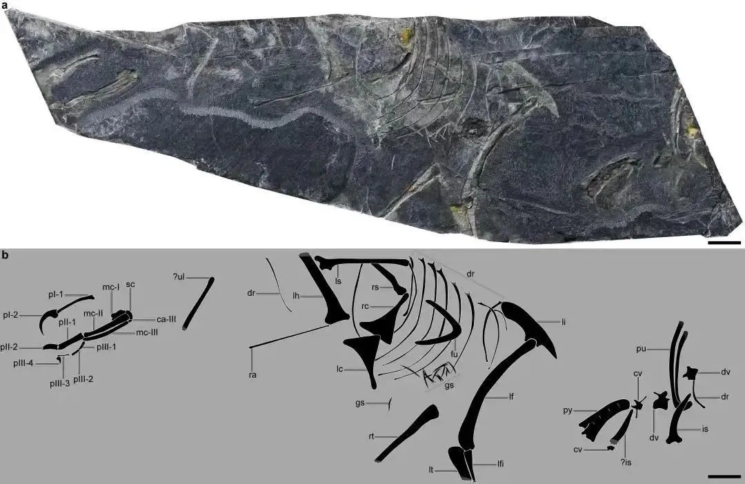 虽然化石不完整,但是它保存了很多重要信息。例如具有分离的肩胛骨和乌喙骨,腰带骨骼显现出很多进步的特征。其中最重要、最特殊的地方就是具有愈合的尾综骨,这是构成现代鸟类体型的基石。