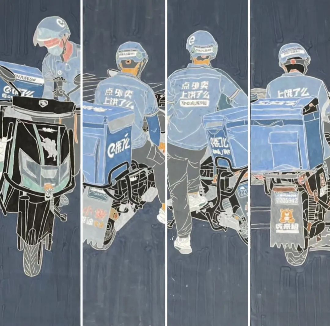 展览中,一幅名为《一路成就托付》的作品格外引人注目。这幅画尺寸为2米×2米,描绘了大街小巷中忙碌的外卖小哥。陈晓峰介绍,他在画这幅作品时,特意选择了4个外卖小哥的形象,通过正面、侧面和背影等不同的角度来展示他们的工作状态,以此表达对外卖小哥辛勤付出的敬意。