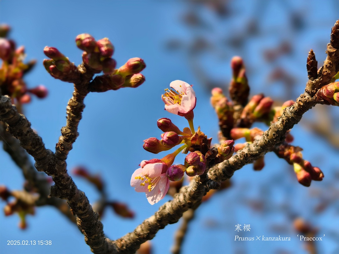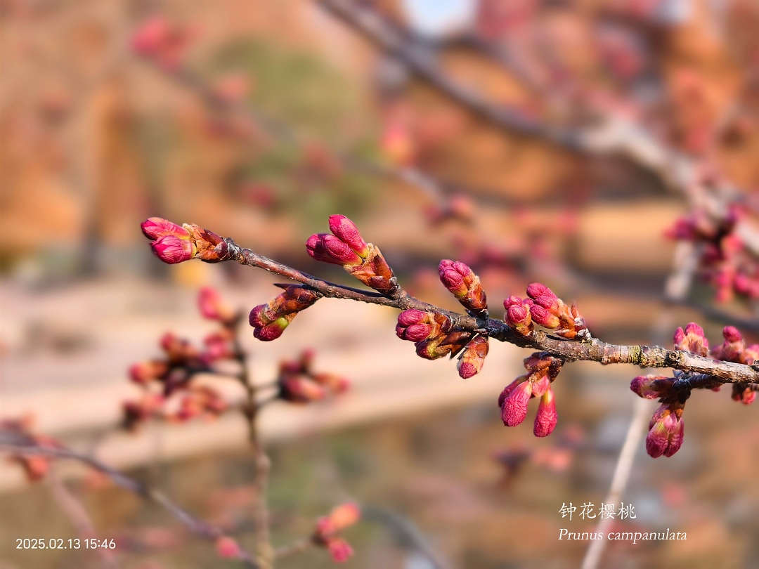 根据目前的观测,寒樱处于初开阶段,花量不到10%,是自2018年冬季引种至今初花期最晚的一年,这和今年1月天气连续干燥,以及2月持续低温有关。寒樱放慢了绽放的脚步,预计在2月下旬进入最佳观赏期。