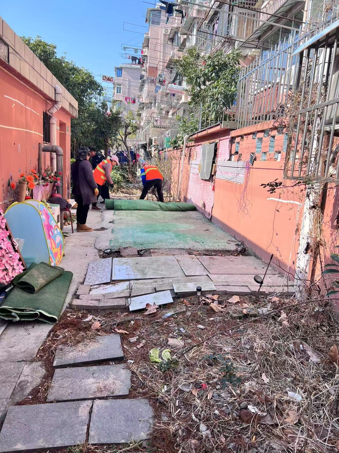 整治行动开展前,居委在通过微信群、电话及上门等方式通知居民,告知居民在两天内自行清理公共区域所种植的蔬菜及违规搭建物品,逾期不清理者由物业统一清理。
