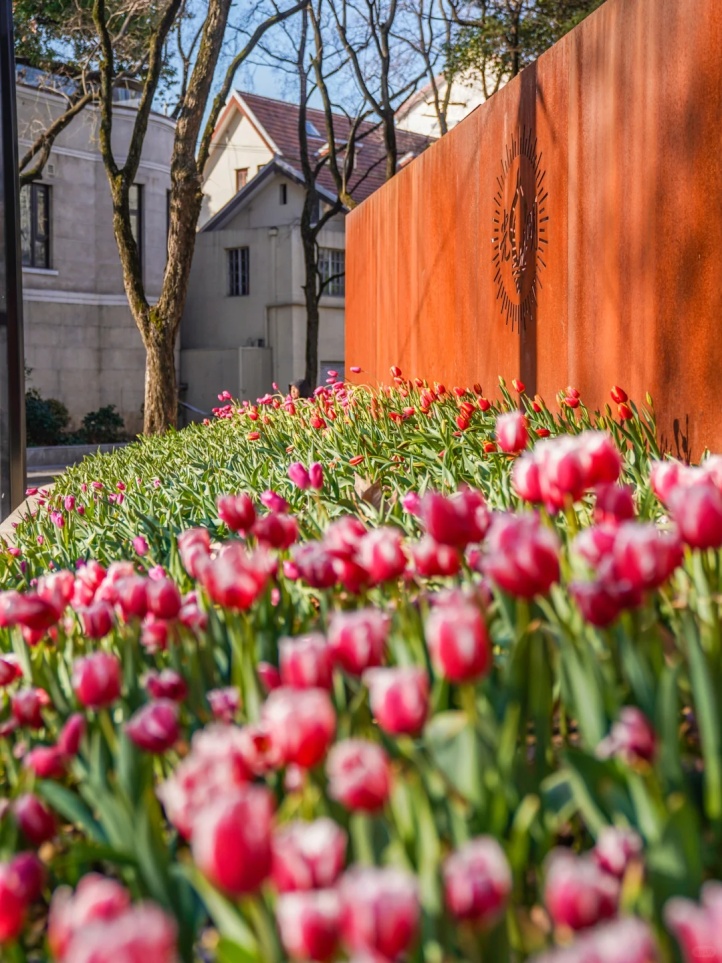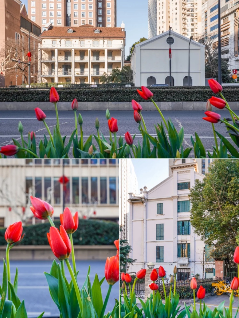 徐家汇沿路随处可见郁金香的身影,橙红色的花朵在砖红色教堂、白色书院背景的衬托下,显得更加明媚热烈。